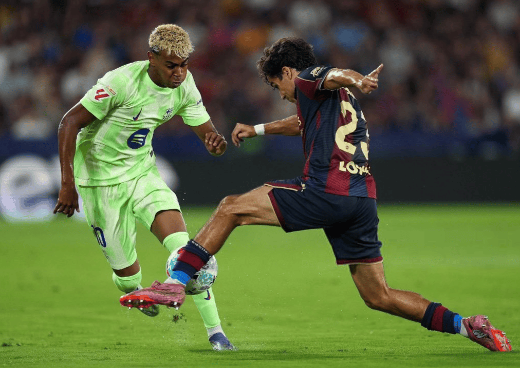 为了能够打脸莱万特主帅,弗里克此役在客场也是派出了最强阵容应战,在4231的阵型中,霍安加西亚镇守龙门,巴尔德、库巴西、加西亚和阿劳霍构筑后防线,卡萨多和佩德里搭档双后腰,亚马尔、拉菲尼亚和拉什福德坐镇中场,单箭头则是费兰托雷斯。